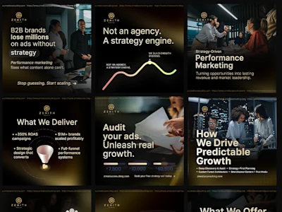 I partnered with Zenith Media Consulting, a B2B performance marketing firm, to design a premium set of 9 social media campaign posts. The goal was to position them as a high-end strategy engine rather than a traditional agency, emphasizing data-driven growth and premium brand identity.